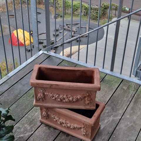 Sæt bestående af 4 terracotta blomsterkrukker med forskellige størrelser, diameter fra ca. 30 cm til 45 cm. Krukkerne har drænhuller i bunden og er velegnede til udendørs brug i haven eller på terrassen.