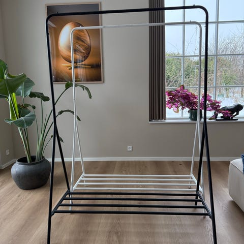 Sælger dette sorte tøjstativ i metal. Det står stabilt og har en praktisk hylde i bunden til sko eller opbevaring.
