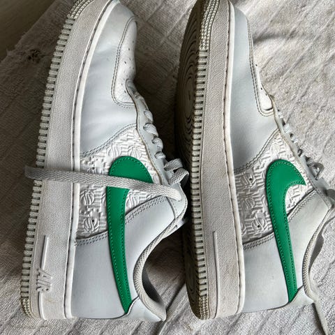 Nike Sneakers i størrelse 43. Skoene er hvide med sort Nike-logo og har en gummisål. Materialet er primært læder med perforeringer på tåområdet for ventilation. Skoene er designet til almindelig brug.