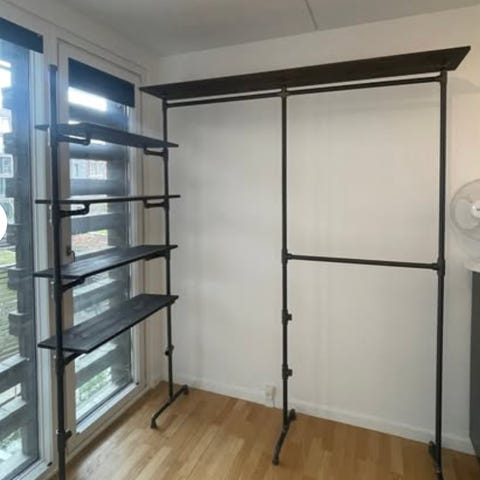 1 fag: Skuffer, 4 hylder. 2 fag: Bøjlestang i 2 meter højde. 3 fag: 2 bøjlestænger - 2 meter højde, og den anden er justerbar.