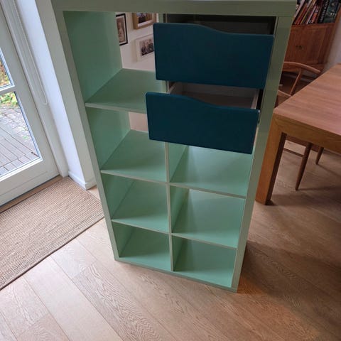 Lys grøn Kallax reol (limited edition) på ben med 8 rum - 2 blå skuffer