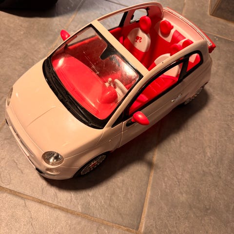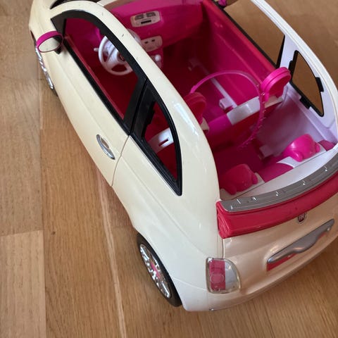 Barbie Fiat 500 legetøjsbil i rød og hvid farve. Bilen har detaljer som åbne døre og tag, og er designet til børn som legetøj. Materialet er plast, og bilen har et realistisk udseende med fokus på børns leg.