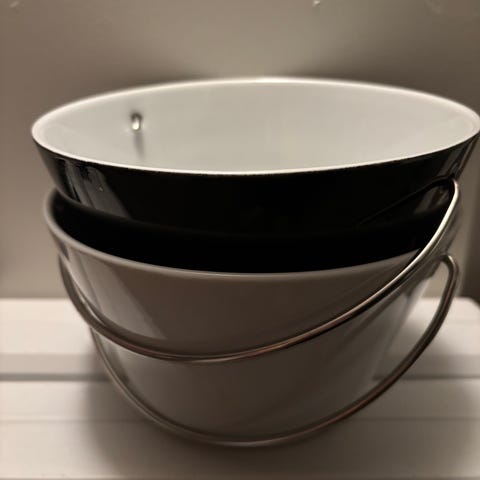 Eva Solo skål med metalhåndtag i hvidt materiale. Skålen har en rund form og er egnet til opbevaring eller servering. Designet med praktisk metalhåndtag for nem håndtering.