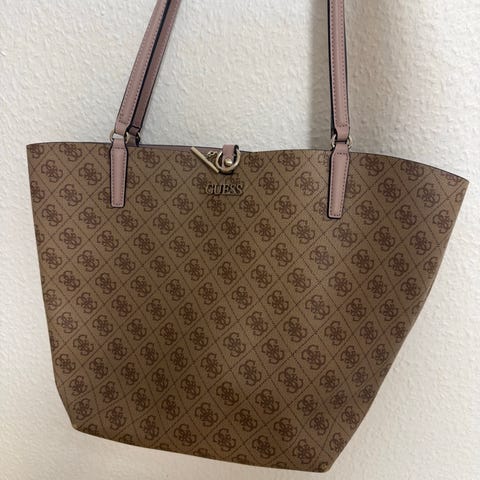 GUESS håndtaske i læder til kvinder i beige. Tasken har en rummelig indretning med flere rum, herunder en mindre indvendig taske. Materialet er tekstureret læder med metal logo-detaljer og en dekorativ vedhæng. Tasken har skulderstropper og metalbeslag i bunden for stabilitet.