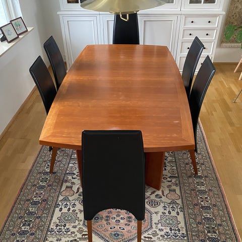 Spisebord i lyst træ til 8-12 personer, 220x100cm (inkl indbygget 50 cm udtræksplade). Ben i samme træ som bordpladen. Står samlet - kan evt skilles ad ved afhentning. Vejer en del, så kom 2 personer.
