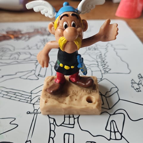 Asterix figur lavet af plastik med multifarvet design. Figuren forestiller karakteren Asterix med hans karakteristiske hjelm med horn, rød bukser og grøn vest. Velegnet som samlerobjekt eller dekoration.