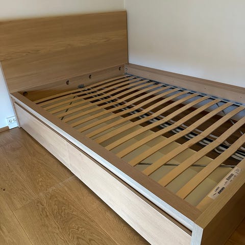IKEA seng med opbevaringsskuffer, størrelse 140x200 cm, farve hvid. Sengen har en ramme med plads til madras og flere opbevaringsskuffer integreret i bunden. Materialet er træbaseret og designet til at maksimere pladsen i soveværelset.