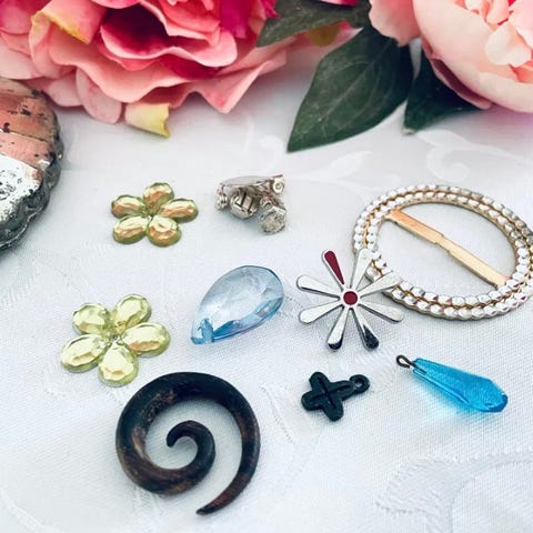 Vintage ring med perler og krystaller arrangeret i en blomstermønster. Ringen har en justerbar sølvfarvet metalring som base. Velegnet som tilbehør til kvinder.