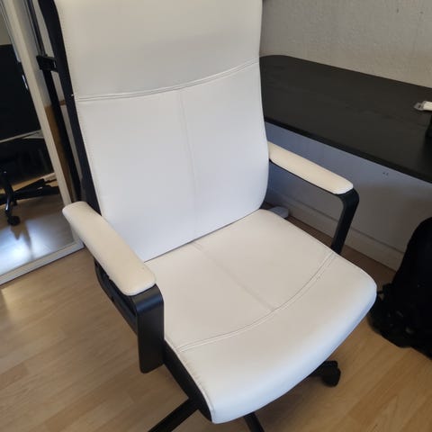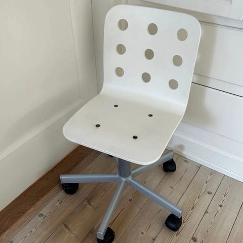 Hvid kontorstol. Justerbar i højde via gaspatron. Gummi-hjul som ikke laver mærker på gulvet.