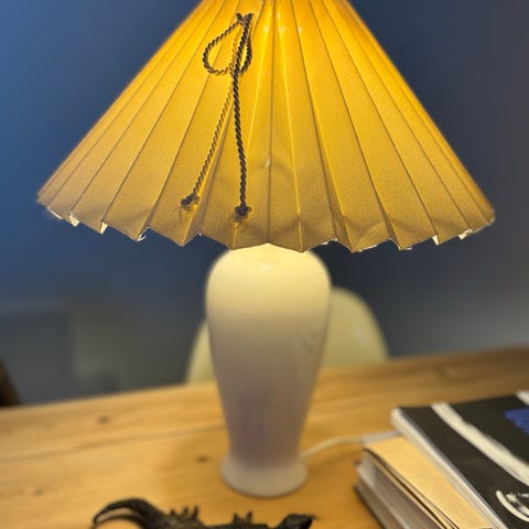 Lyskilde design i hvidt glas. Højde med fatning 21 cm og diameter 15 cm. Afbryder og el i perfekt stand.