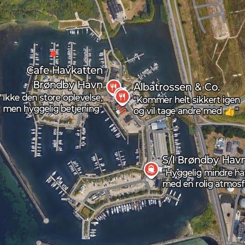 Billede taget op fra en bro, som viser bådpladsen oppefra. Det hyggeligste sted i Brøndby Havn.