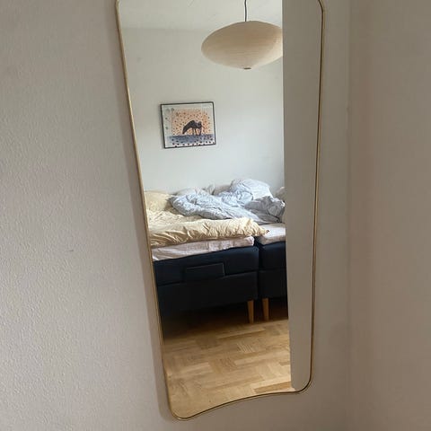 Gubi rundt vægspejl med sort ramme og ophængssnor. Spejlet har et enkelt og funktionelt design, der kan anvendes i forskellige rum til daglig brug.