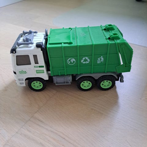Skraldebil inkl. skraldespand. Kan blinke og lyde som en rigtig skraldebil. 30 cm.