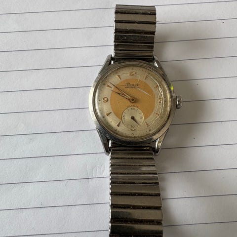 Kundo Bordur Ur med glasdome og gylden finish. Uret har en rund urskive med romertal og viser tid samt månefase. Designet er unisex og kan bruges som dekorativt bordur i hjemmet.