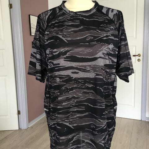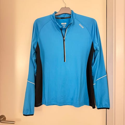Kortærmet løbebluse. H&M. Med teksten: “Run this block”. Med en refleksstribe på ryggen. Kan hentes nær Storcenter Nord, Aarhus, eller i Randers. Kan også sendes.