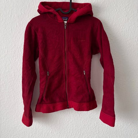 Vintage Patagonia fleecejakke til kvinder, str. XS, flot bordeaux rød farve, blød og varm – perfekt til både efterår, vinter og festival. Komfortabel pasform, hætte og lynlås, kvalitet fra et ikonisk mærke!