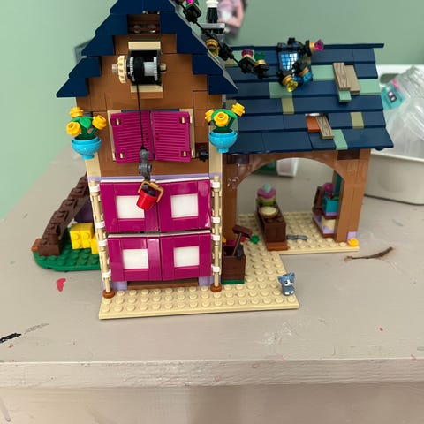 LEGO Friends legetøjsbygning med to etager, der indeholder flere rum og tilbehør. Bygningen er lavet af plast og har farver som gul, lilla og hvid. Sættet inkluderer møbler og figurer, der kan bruges til leg og samling.