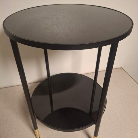 Mål: højde 33,5 cm, diameter bordplade 15,5 cm, diameter bund 33,5 cm
