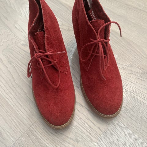 Tamaris højhælet støvlet i vinrød velour materiale. Støvletten har en højde på cirka 9 cm og lukkes med lynlås på siden. Størrelse 38. Købt for kr. 500, sælges for kr. 250.