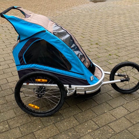 Trille Jogging Barnevogn med tre hjul, sort farve og robust stel. Velegnet til løb og udendørs brug. Justerbart håndtag og stor kaleche for beskyttelse mod vejr. Komfortabel siddeplads med sikkerhedsseler.