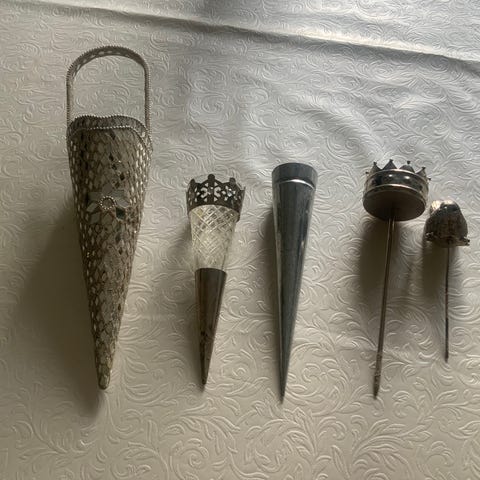 Kræmmerhus, "Guld" kræmmerhus i metal med hang og sløjfe ned af kræmmerhus.