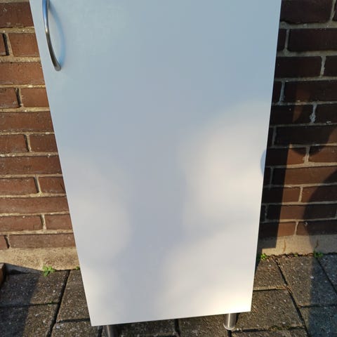 Hvidt vægskab med en enkelt dør og en hylde. Skabet er lavet af træmateriale med en glat overflade. Døren er monteret med metalhængsler og kan åbnes til siden. Skabet har en åben sektion under døren til ekstra opbevaring. Velegnet til opbevaring i køkken, badeværelse eller andre rum.
