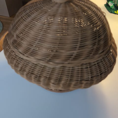 Skøn ældre garnkurv / kurv i flet med låg på bambusben