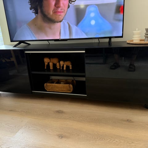 Flot TV-møbel med skydelåge i sort glas. Der er hul til ledninger bagpå. Brugsspor i form af mindre ridser, men de ses ikke på afstand, Den ene side har en hylde på midten, der egner sig godt til f.eks. spillekonsol. OBS: Tape i hjørnet fjernes inden møblet afhentes - det er bare så vores datter ikke kan komme til elektronikken :)