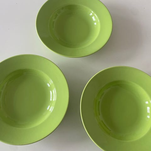 Det er fire tallerkener i hhv blå, gul, grøn og lyserød.