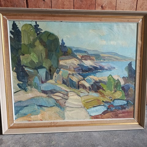 Ukendt landskabsmaleri udført i olie på lærred med Maleriet forestiller en kystlinje med klipper, hav og himmel i naturlige farver. Indrammet i en guldfarvet ramme. Bagsiden viser lærred spændt på træramme med ophængningssnor.