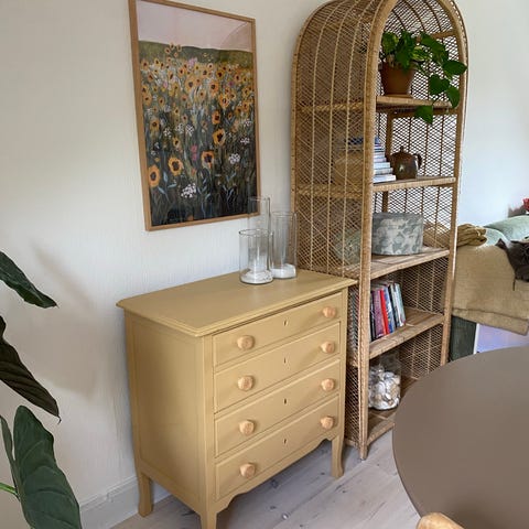 En reol jeg selv har købt og istandsat (og været meget glad for, sælges kun pga flytning og manglende plads) Den er malet uden på. Og malet inden i overskabene. Der er en rest maling man som kan medfølge (her tænker jeg hvis der kommer en ridse mens man transpotere det. Så kan man dække det når man får det hjem).