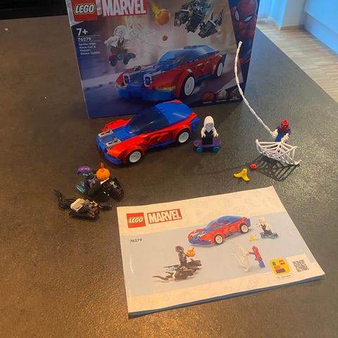 Byggesættet indeholder 3 LEGO minifigurer - Spider-man, Vulture og en chauffør - en superseje motorcykel og en bankbil.