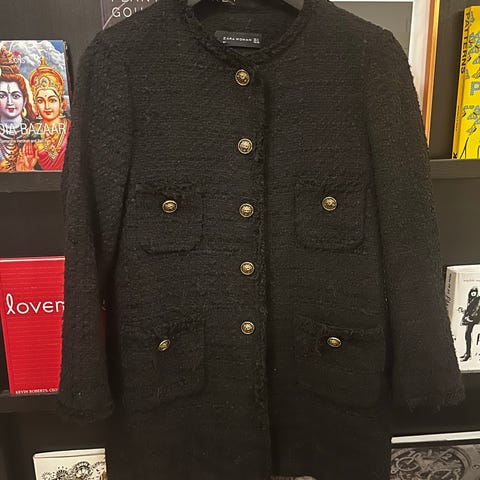 Oliver Grant lang tweed jakke sort med grå nister. Lukkes med hægter.