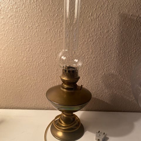 Flot ombygget petroleumslampe med ca. 2 meter el ledning. Både "krop" og skærm af opaline mens brænder og holder til skærm er messing. Højde er 46 cm, største bredde er 20 cm. Skærmen har en diameter på ca. 18,5 cm i bunden. Skærmen har ridser i kanten hvor den hviler på skærmholder. Det kunne være Holmegaard opaline glas, men uklart da jeg har arvet lampen og da der ikke er mærker / stempler. Brænder er af mærket "Kosmos Brenner" produceret primært 1890-1910. Umiddelbart virker det muligt at rekonstruere lampen til petroleum. SENDES IKKE.