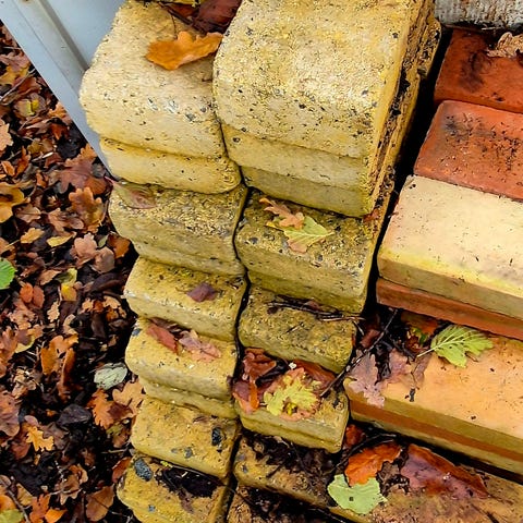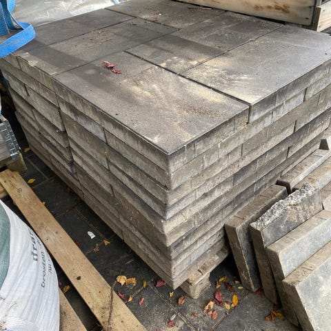 60m2+ eller ca. 600 stk. røde havefliser. En flise måler 40x20x5.