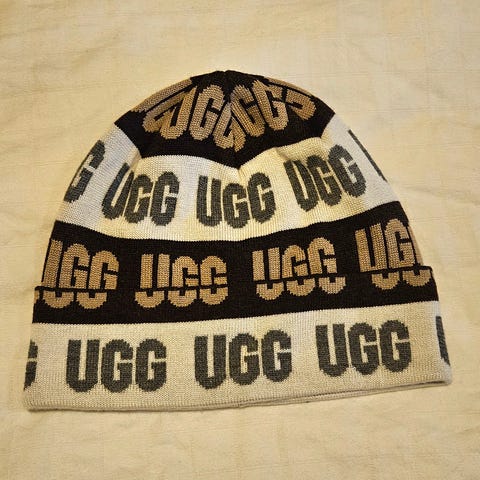 Strikket hat fra UGG, cirka str. Small (55 cm). Den er meget blød og pels kvasten giver et sødt look.