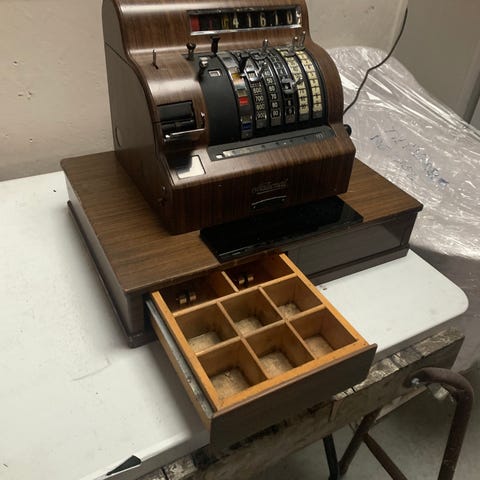 National Xener kasseapparat med træfinish. Mekanisk kasseapparat med numerisk tastatur og manuel håndsving. Udstyret med en skuffe opdelt i flere rum til opbevaring af mønter og sedler. Visning af beløb via rulleindikator. Designet til brug i detailhandel til registrering af salg og håndtering af kontanter. Fra 1929 lavet i Ohio.