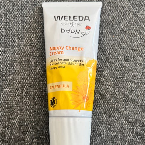 Kropspleje, Weleda, De fire gule bøtter er ikke åbnet og dermed heller ikke brugt. De er alle sammen til babyer. Det drejer sig om: Plejecreme til krop og ansigt mod tør hud, Creme der beskytter huden mod vejret, bodyshampoo og shampoo i en og badeolie til irriteret hud og afslapning.