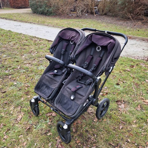 Bugaboo tvillingeklapvogn i sort farve. Klapvognen har to sæder ved siden af hinanden, hver med seler og justerbar rygstøtte.