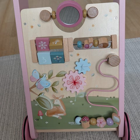 Little Dutch aktivitetsvogn i træ med forskellige legetøjselementer, herunder spejl, gearhjul, tal og former til børn. Vognen er designet til at støtte motorisk udvikling og leg for små børn. Farverne er bløde og neutrale, velegnet til både drenge og piger.