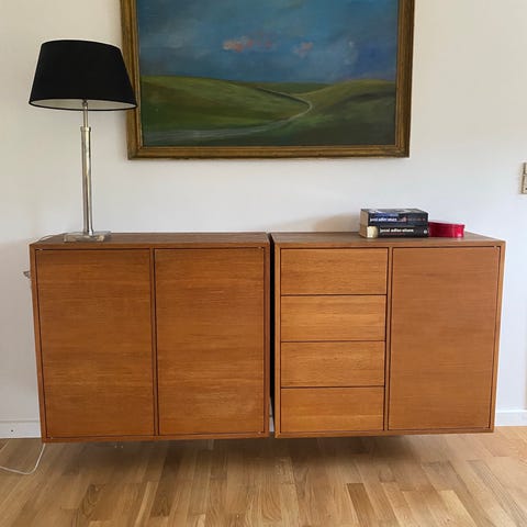 Olieret eg. Stort set som nyt. Fin stand 4 stk vægophæng og 1 stk hylde og 1 stk skrivebordsmodul med hylder. Sælges stadig hos bolia. Designet af Tina Ottesen Stride. Elegant som string hylderne, modulært kan udvides med flere elementer. Nypris for vægophæng per stk 855,- skrivebord 5295,- hylde 1775,- kort sagt her kan spares mange penge. Har også et ekstra men plettet skrivebordsmodul, som kan fås for 500,- oveni