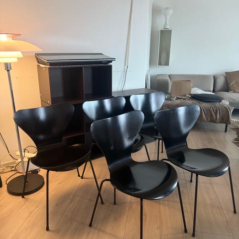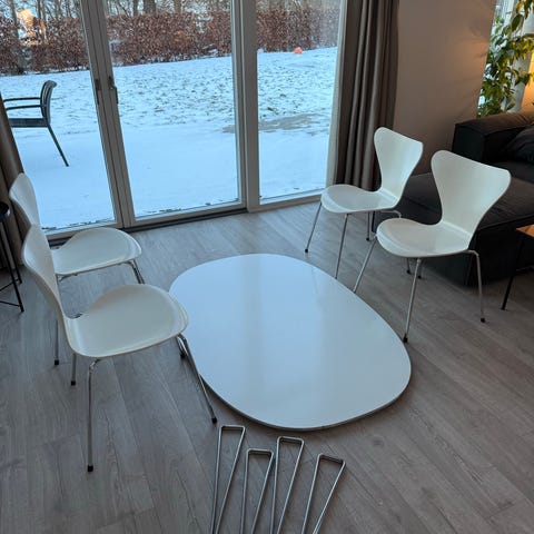 Smukt og klassisk dansk design-sæt fra Fritz Hansen bestående af seks originale Serie 7 stole (model 3107, design Arne Jacobsen) samt et Piet Hein Superellipse spisebord fra midt-80’erne.