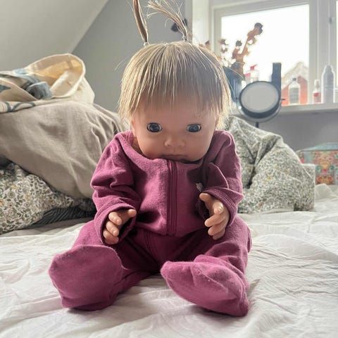 Iført blå og grøn stribet heldragt. Dukken har blødt hår og bevægelige led. Heldragten er med knapper foran og lavet i blødt stof. Dukken er egnet til leg og samling.