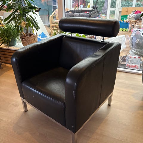 Sort læder lænestol med tilhørende fodskammel, ca. 4 år gammel. Lænestolen har polstret ryg og armlæn for komfort. Materialet er sort læder, og designet er egnet til afslapning i hjemmet.