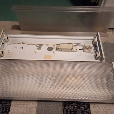 Ikke oplyst Loftslampe 21 stk. i hvid metal. Lampen har et rektangulært design med gitterbeskyttelse over lyskilden. Velegnet til installation i lofter, primært til belysning i kontor- eller lagerområder.