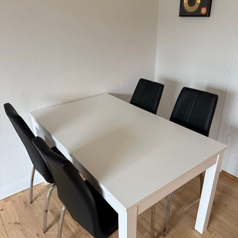 Spisebord med hvid bordplade og metalben. Sættet inkluderer fire træstole med ryglæn med udskæringer. Bordet og stolene har et enkelt og funktionelt design, velegnet til spiseplads. Materialerne omfatter træ til stolene og metal til bordbenene.