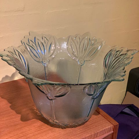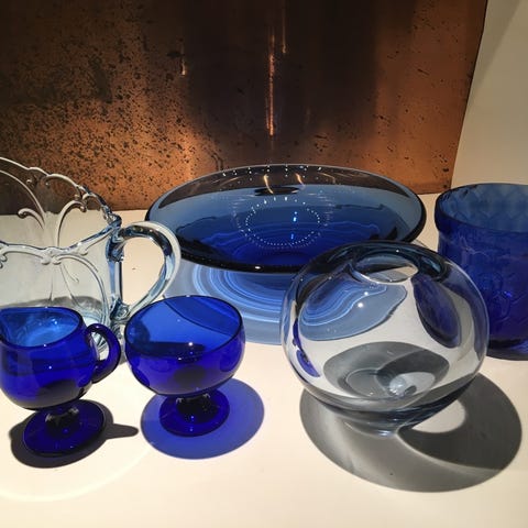 Gammelt blå glas fire dele, urtepotteskjuler, underskål, 2 små fade