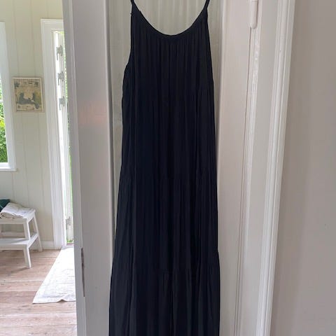Flot lang kjole fra Skovbjerg i creme/nude i str L/40. Den er brugt 3 gange. Lavet af viscose og bomuld. Måler 2x50 cm, længde ca 118 cm. Sælges for 200 kr. Se også mine andre annoncer!!!