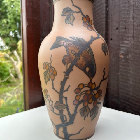 Håndmalede fugle- og blomstermotiver i varme nuancer.