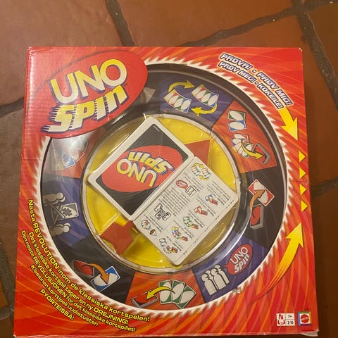 Mattel UNO Spin brætspil med drejeskive og kort. Spillet indeholder en rund drejeskive i midten og et sæt UNO-kort til at spille med. Egnet til flere spillere og designet til underholdning i sociale sammenhænge.